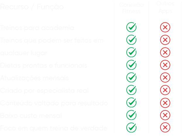 Nossos treinos e dietas são especificas E PENSADOS PARA DIFERENTES PUBLICOS, o Conexão Fitness entrega um caminho prático e direto — feito por quem vive o treino de verdade.